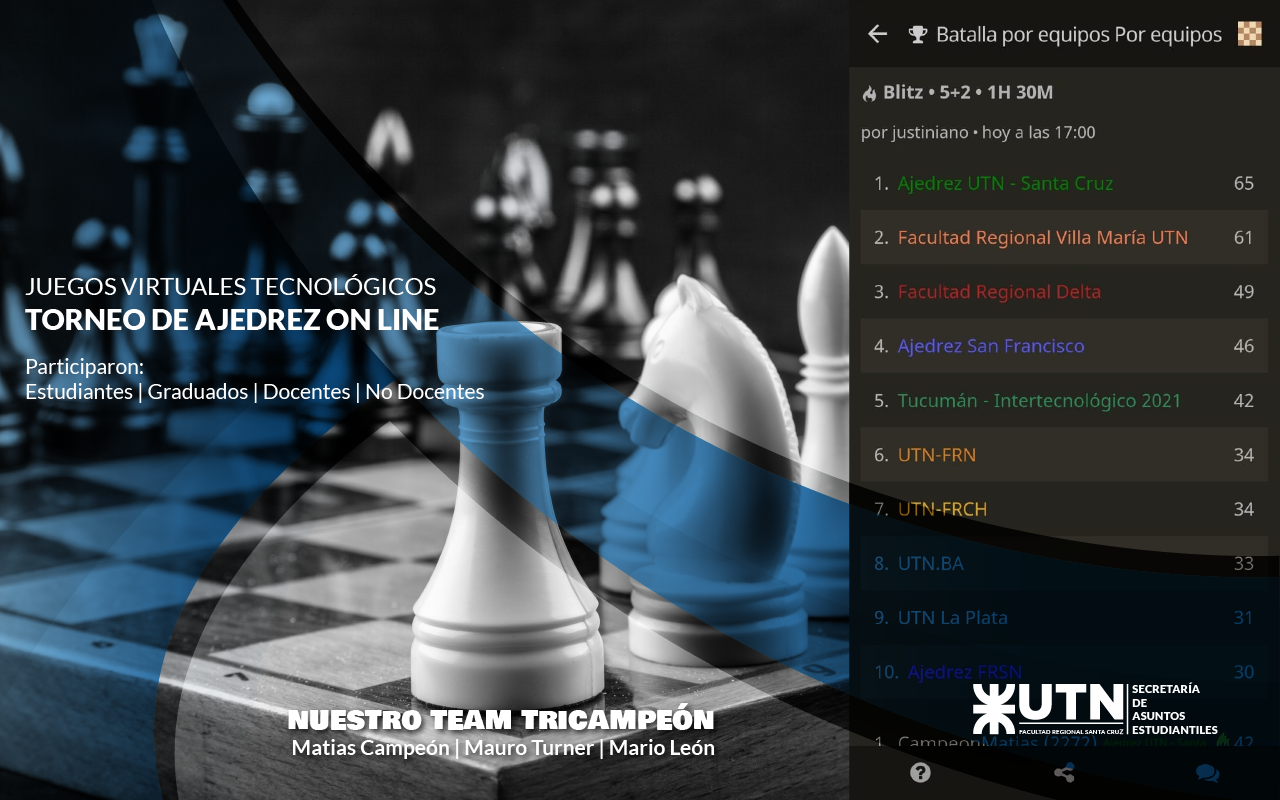 El domingo 04 de julio desde las 17:00 horas se jugó, de manera virtual, el Torneo de Ajedrez en el marco de los Juegos Tecnológicos 2021, obteniendo nuestra casa el primer puesto nuevamente.